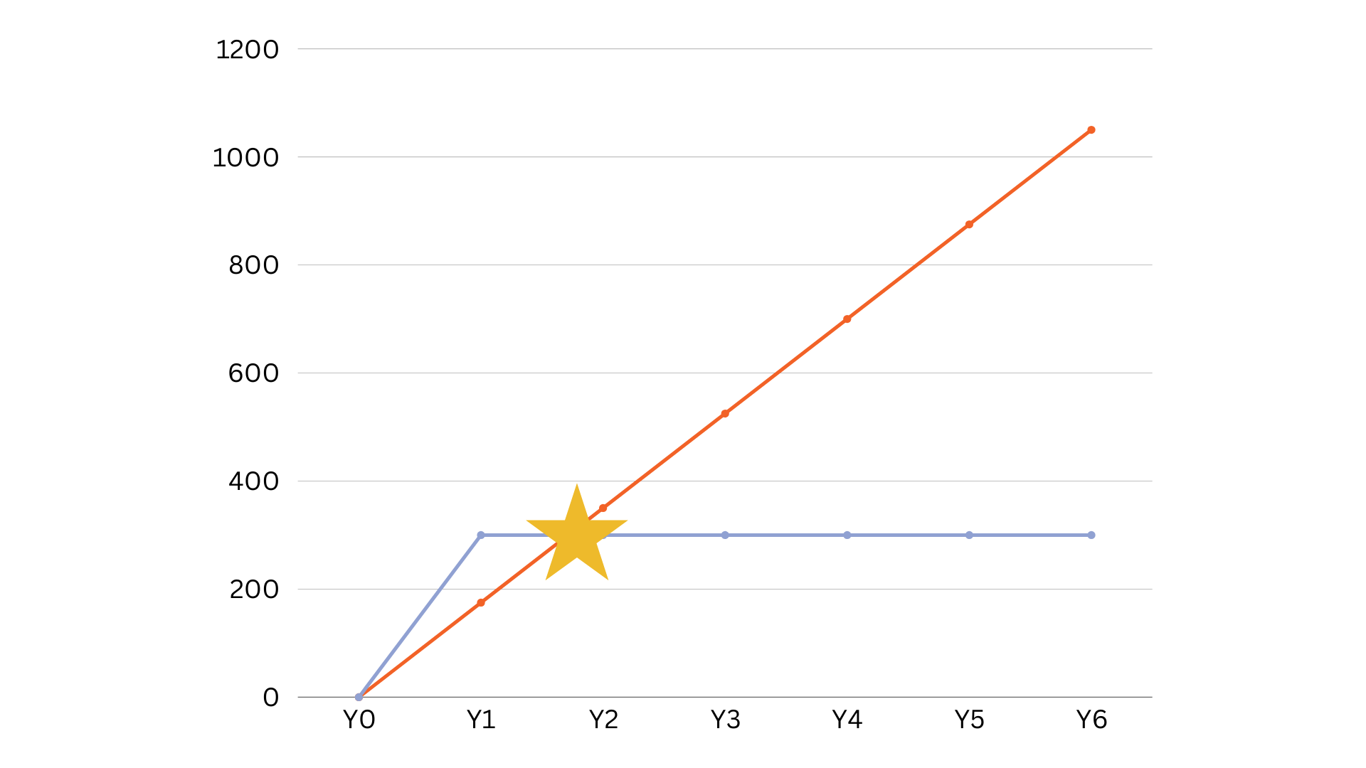 Image: Total cost of hearing protection for one employee over 6 years. Orange indicates disposable, blue indicates custom, star indicates point of ROI for custom.